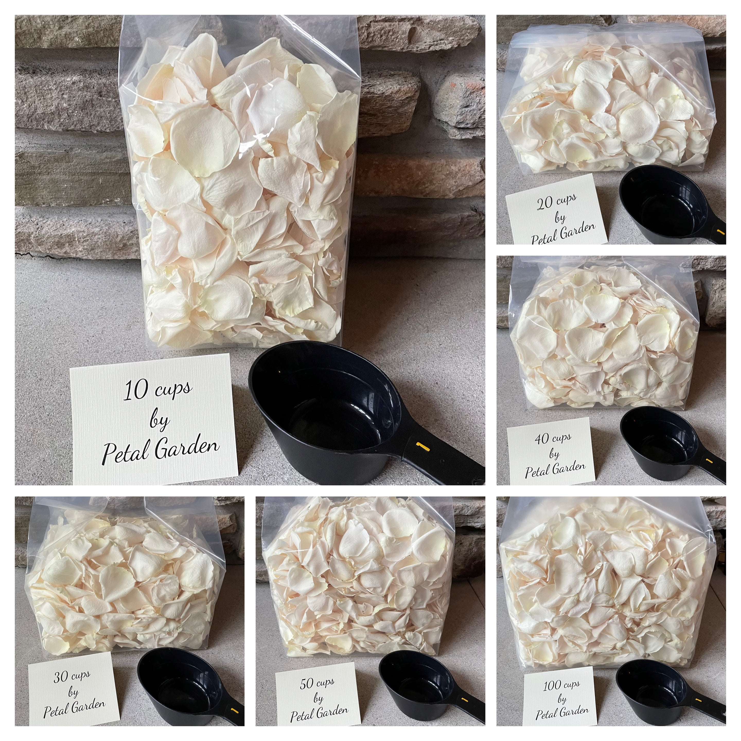 Our petals are custom packed in a sealed bag based on the size of your order. For example, if you order 10 cups of petals (a standard measuring cup), you will receive one bag containing a volume of 10 cups of petals.  In our photos in the listing you can see our various package sizes. If you need help determining how much you need, just send us an email with your details and we'll be glad to assist.