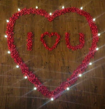 Our Silk Rose Petals package contains 1,000 red silk rose petals and 18 LED tealight candles, enough to create a romantic atmosphere in a small bedroom or apartment.  The heart in the photo is 6 feet across, enough for two people to stand in.