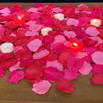 Our Silk Rose Petals package contains 1,000 silk rose petals in shades of red and pink, along with 2 rose scented tealights and 6 unscented tealight candles. These are enough to create a romantic atmosphere in a small bedroom or apartment.  Our silk rose petals are made from a high quality micro-peach material to look as realistic as possible. For the scented tealight, we are now using handmade soy tealight candles with a realistic rose scent.