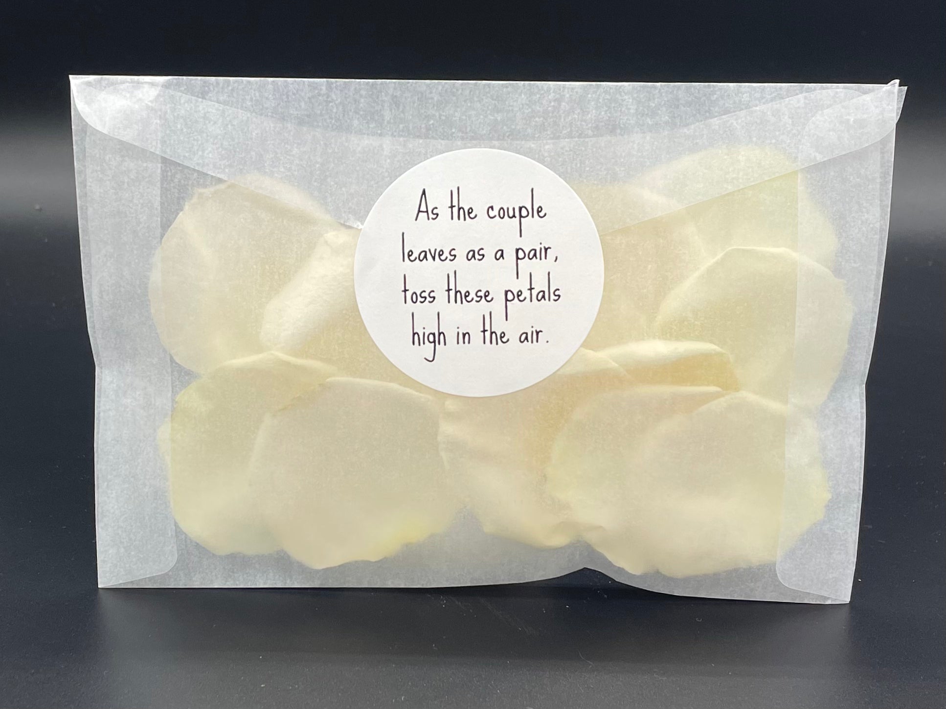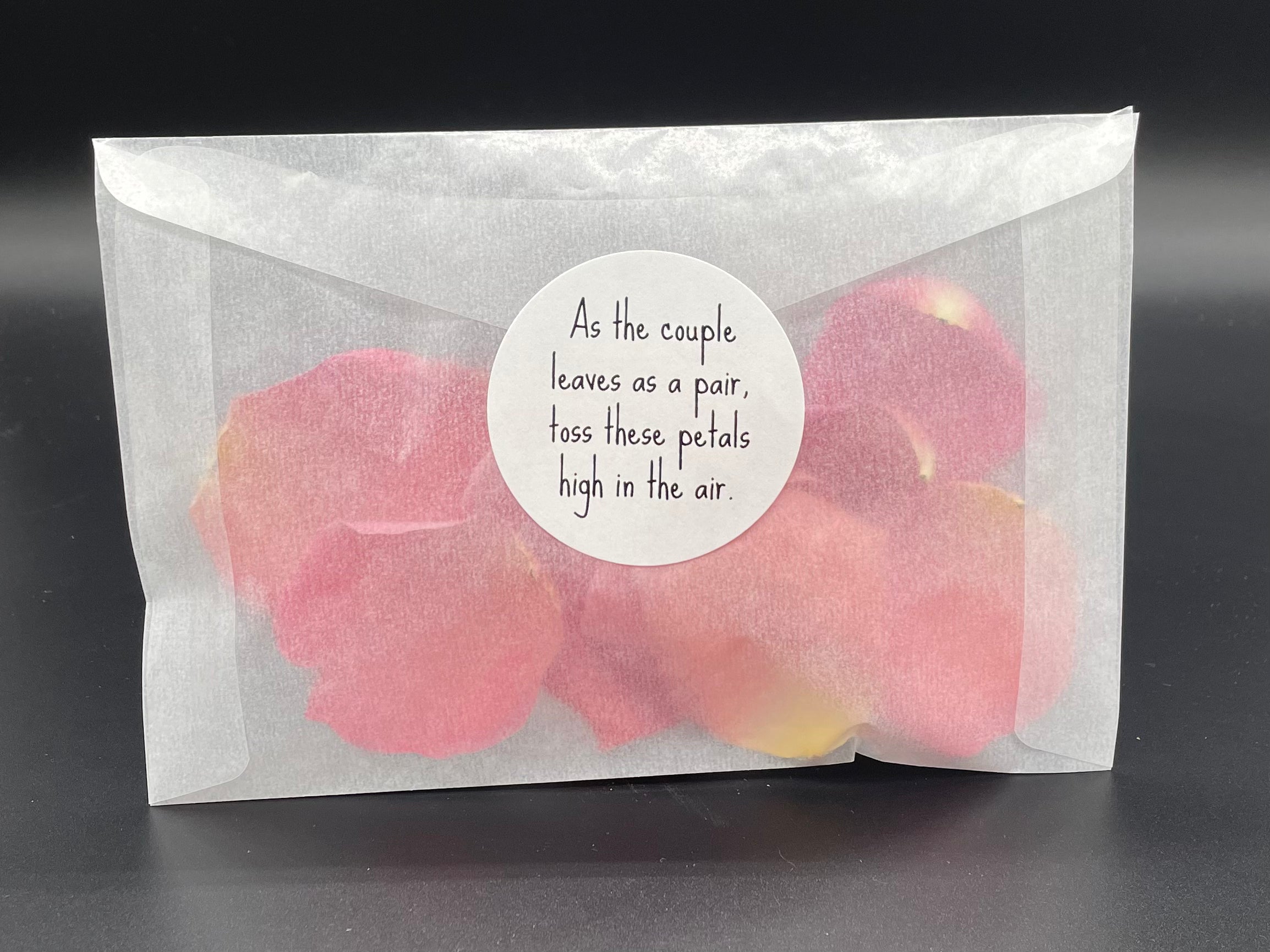 Our Wedding Rose Petal Toss Packets include the rose petals, envelopes, and custom labels. Select your colors from our entire selection of freeze dried rose petals, and we will package them for you.